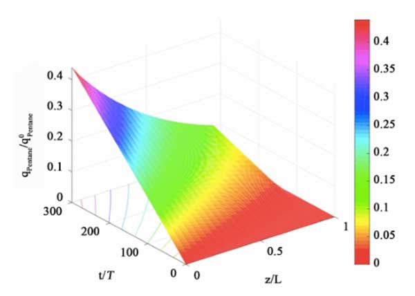 在圖5中,我們顯示了戊烷在活性炭上的吸附負載的時空分布。戊烷是油蒸氣中的主要成分之一。由于我們假設活性炭在吸附過程中處于恒溫狀態,且油蒸氣濃度很低,因此線性驅動力模型可以很好地模擬吸附質的吸附動力學?梢砸韵嗤姆绞侥M油蒸氣中的其他組分。
