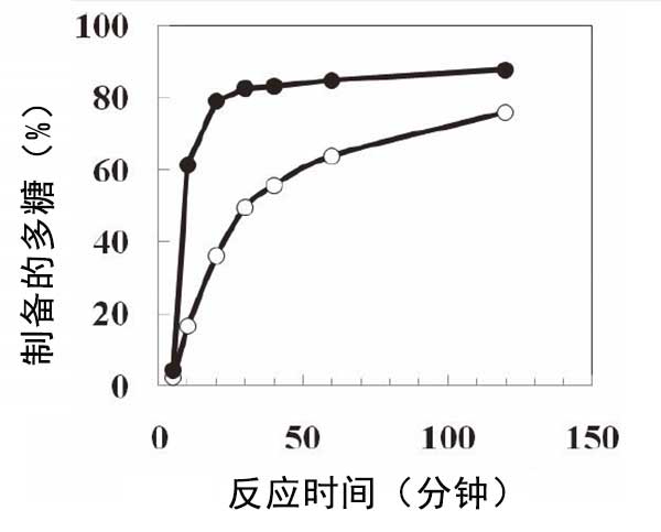 圖1:在活性炭存在(實心圓圈)或不存在(空心圓圈)的情況下從葡萄糖漿制備難消化的多糖。