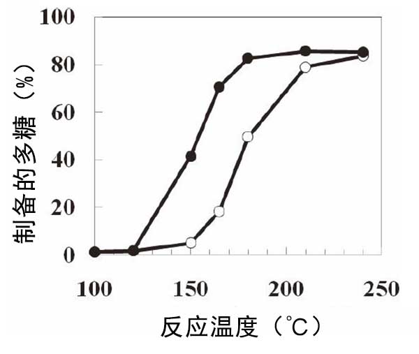 將含有或不含活性炭的葡萄糖漿在各種溫度下加熱30分鐘(圖2)。從100℃至120℃,觀察到多糖難消化部分的含量幾乎沒有增加。含有和不含活性炭的多糖難消化部分的含量在150℃下為41.4%和4.9%。在120至180℃下,在活性炭存在下不可消化部分的含量顯著增加。在高于180℃的溫度下,難消化部分的產生是恒定的。因此,當加熱溫度高時,可以在短時間內達到目標產率。在設計制造過程時,反應溫度和時間的平衡很重要。
