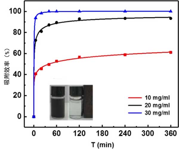 圖1.不同量的活性炭[10mg(紅線)20mg(黑線)30mg(藍線)]對DBT的吸附效率。