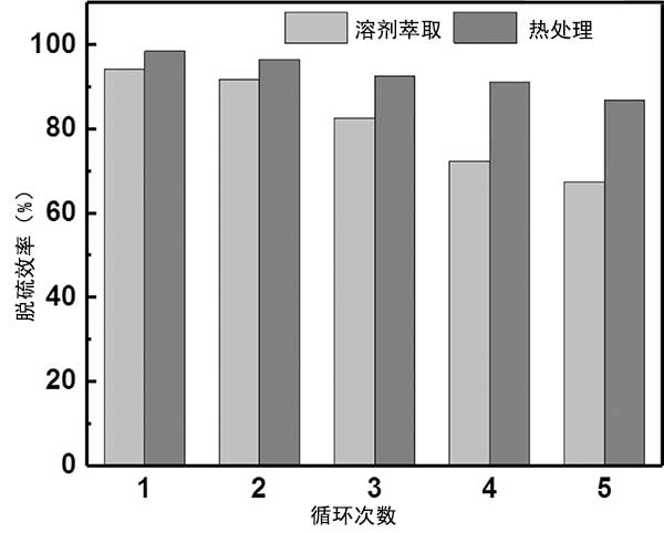 在吸附脫硫中使用的各種方法中,溶劑萃取和熱處理被認為是常用的再生方法。在這項實驗中,溶劑萃取和熱處理都用于研究活性炭的再生性能。關于溶劑萃取方法,在第一次吸附循環完成后,通過外部磁體收集活性炭,并通過添加甲醇作為萃取溶劑進行洗滌。然后,將活性炭干燥用于下一次運行。如在示出的圖3,它被發現的活性炭可在前兩次運行時通過溶劑洗滌輕松再生。這可能是因為物理吸附在吸附過程中占主導地位,并且由污染引起的大多數失活吸附劑可以通過溶劑萃取方法在初始循環中再生。然而,在連續五次再生操作后,吸附劑與新鮮吸附劑保持67%的初始脫硫效率(相當于20.22mg DBT/g)。隨著循環次數的增加,活性更高的位點與DBT相互作用,并且后一次運行留下的活性位點更少,從而導致隨后的再生運行中脫硫效率降低。為了提高活性炭吸附劑的再生效果,引入了熱處理方法。通過溶劑萃取再生后,將獲得的活性炭在氮氣氛下在350℃下活化1小時來恢復活性。
