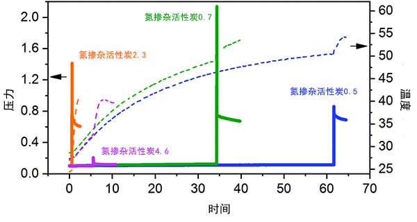 圖2: 不同質(zhì)量的氮摻雜活性炭機(jī)械化學(xué)合成的溫度(虛線)和壓力(實線)曲線。