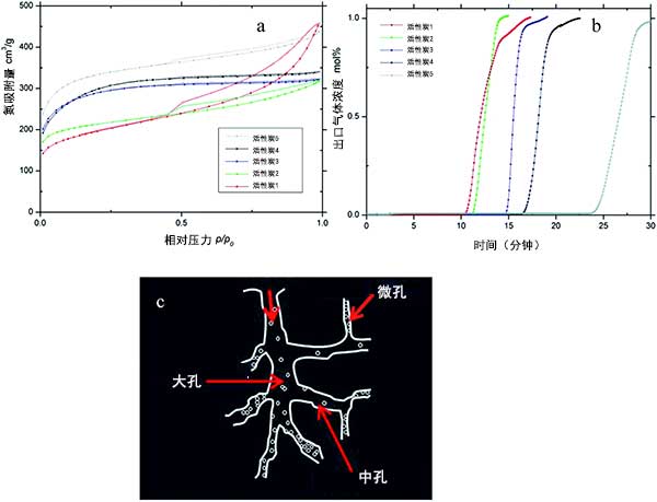 圖2:(a)氮吸附等溫線,(b)活性炭樣品的C 3 H 8吸附結果,(c)吸附在活性炭中的氣體的卡通圖像。