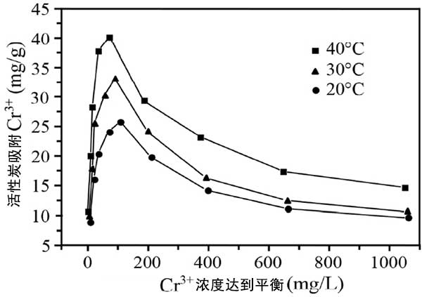 2、已經確定,活性炭在20、30和40℃下的鉻吸附等溫線具有取決于平衡濃度的不規則形狀。三條曲線顯示出類似的趨勢,陽離子攝取量的初始增加非常快。達到最大值后,隨著平衡溶液中鞣劑含量的增加,它們明顯降低。