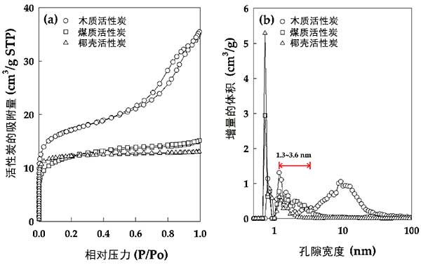 圖2:活性炭的物理性質。(a)氮的吸附/解吸等溫線和(b)活性炭的孔徑分布。