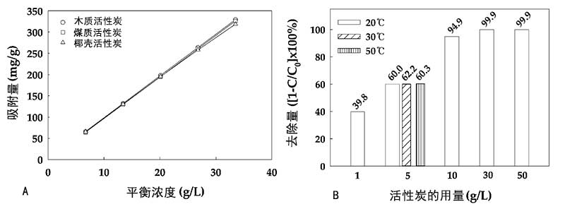 圖3:(A)作為平衡濃度的吸附量取決于不同類型的活性炭,(B)活性炭的含量對去除效率的影響。
