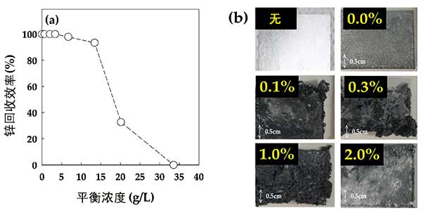 如圖4所示,在吸附物濃度為0.00-0.50%存在下的鋅回收效率至少恢復99.9%。在超過0.50%的吸附物存在下,鋅回收效率趨于迅速降低。一個電極的表面由具有不同吸附內容物的電解質中回收,在沒有吸附物的情況下,電極表面顯示出均勻的沉積。然而,對于0.1-2%的吸附物,電極表面看起來非常不均勻地生長。向電解質中添加有機物改變了金屬沉積物的特征。從顯微鏡分析中,向電解質中添加有機物導致在沉積表面上形成孔。因此,吸附物的存在降低了鋅的回收效率并導致不均勻的沉積。因此,去除吸附物必須小于0.1%。