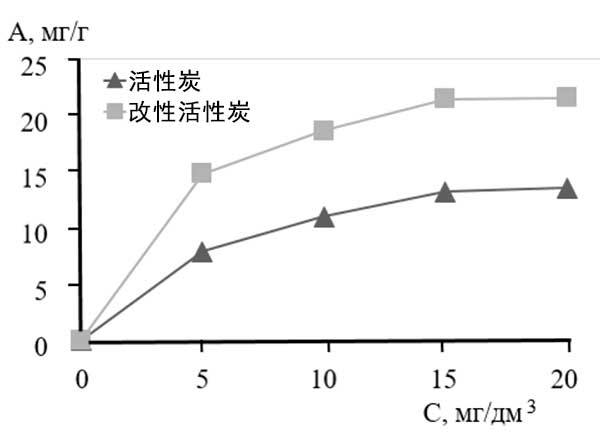 用發煙硫酸處理活性炭導致磺酸鹽基團捕獲吸附劑表面和孔內部。用二氯乙烷對活性炭的初級處理有利于磺化劑在孔深度中的滲透,從而增強氧化,并由此促進磺酸鹽基團的形成?咨疃戎谢撬猁}基團的存在增加了吸附劑相對于汞離子的吸附能力。對于改性活性炭在靜態條件下對汞離子吸附的研究結果,根據獲得的實驗數據,繪制了活性炭和改性活性炭的比較等溫線(圖1)。