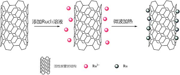 所有載釕活性炭上的釕負載量理論上為5%。通常,將活性炭加入120mL乙二醇中。并將混合物在超聲處理30分鐘以確保活性炭均勻分散。超聲處理后,在連續攪拌下滴加3.0mL RuCl 3水溶液30分鐘。然后是使用NaOH乙二醇溶液將混合物的pH調節至4.0。然后,在連續攪拌24小時后,將溶液放入微波合成反應器中加熱100秒。過濾混合物溶液,用去離子水洗滌直至濾液的pH達到7.0,并在80℃下真空干燥。將樣品研磨成粉末使用。由于活性炭的表面是疏水的,它們傾向于在極性溶劑中聚集。并且由官能團改性的活性炭可以提供足夠的孔隙以使釕納米顆粒均勻地分布在活性炭的表面上。在通過微波加熱的多元醇方法制備活性炭負載的釕納米顆粒。合成過程如圖1所示。