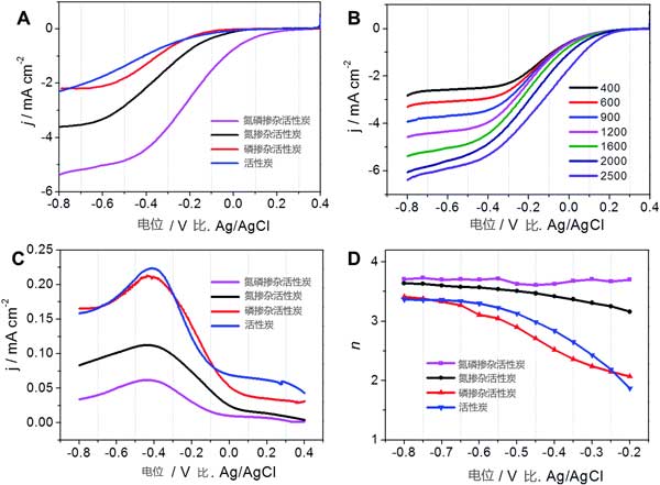 活性炭樣品通過兩步法制備,包括原位氧化聚合和高溫熱解。這里,苯胺和植酸分別用作氮源和磷源。為了研究氮磷碳比對活性炭的氧化還原電催化活性的影響,在中性介質(zhì)中進行循環(huán)伏安圖。旋轉圓盤電極伏安圖在氧飽和的50mM磷酸鹽緩沖溶液中進行,結果顯示在圖2A中。在摻雜碳改性后,活性炭基催化劑的起始電位顯示出從0V到+0.22V的大的正向偏移,氧化還原電流密度也大大增加。此外,由共摻雜碳改性的活性炭電催化活性優(yōu)于由單摻雜碳改性的活性炭電催化活性。在進行旋轉環(huán)盤電極測量以研究不同催化劑的過氧化氫的產(chǎn)生(圖2C)。正如預期的那樣,氮磷摻雜活性炭顯示出比其他催化劑更低的過氧化氫產(chǎn)生。可以看出,氮磷摻雜活性炭在氧化還原起始電位和高電流電流方面對氧化還原具有優(yōu)異的電催化活性,突出了N,P共摻雜和中孔結構對氧化還原的重要性。