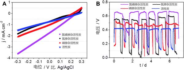 不同摻雜比的活性炭催化劑在微生物燃料電池中的實際性能,各種氧化還原催化劑的空氣陰極。線性掃描伏安法曲線由圖3A表明,所有的空氣陰極具有摻雜碳改性的活性炭催化劑表現(xiàn)出比原始活性炭催化劑的更高電流響應。與氮摻雜和磷摻雜相比,氮磷共同摻雜的活性炭顯示高電流密度。如圖3B所示,使用雙摻雜的活性炭催化劑的空氣陰極燃料電池能夠在1000Ω的外部電阻上產(chǎn)生0.668V的穩(wěn)定電壓,這遠高于本期制造的其它催化劑。這些結果意味著摻雜碳的改性是增強活性炭的氧化還原活性的可靠方法。此外,當在微生物燃料電池的空氣陰極中用作氧化還原時,由氮和磷共摻雜碳改性制備的活性炭優(yōu)于氮磷單獨摻雜改性的活性炭。