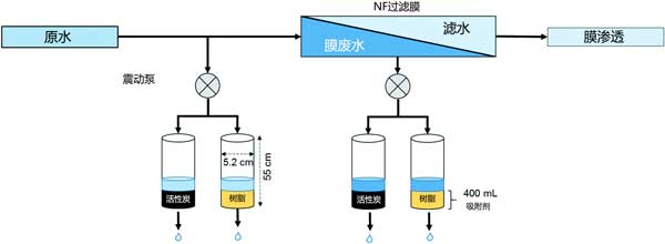圖1:使用兩個串聯的納濾膜處理全氟烷基物質污染的原水的示意圖,產生過濾水和膜廢水。另外,使用活性炭或陰離子交換樹脂處理原水和膜廢水。