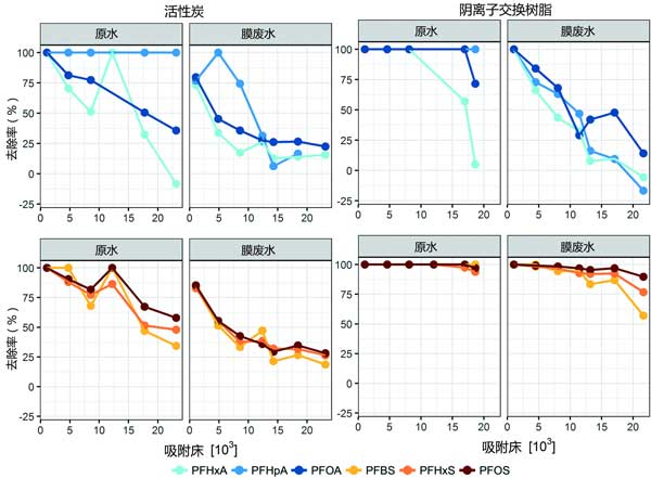 實驗總計進行了12周,每兩周取樣。這導致所有活性炭色譜柱的實驗運行時間為24個,分別處理原水和膜廢水的陰離子交換樹脂色譜柱。在每次采樣之后每周對所有柱進行反洗,以模擬典型的全尺寸操作?偣卜治隽15種全氟烷基物質,將吸附材料相對于全氟烷基物質去除的性能與柱吸附模型的性能進行了比較。