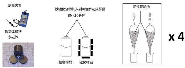 該實驗在實驗室規模上進行,其中研究由八個分離漏斗組成。將各個分離漏斗成對分組并填充相同量的活性炭和其它吸附劑的過濾床。在每對分離漏斗中,一個用于對照樣品(不含磁性),而另一個用于磁化樣品。對照和磁化樣品分離漏斗中各個過濾材料的重量一樣。將鐵錳化合物加入到蒸餾水濃縮制備實驗用的水溶液。對于磁化過程,使用永磁鐵氧體磁鐵進行磁化。然后通過填充有活性炭和其它吸附劑的沉積物過濾溶液。未校正樣品的pH。pH的差異與添加單獨的金屬標準溶液有關。圖1顯示了制備用于過濾和過濾過程的模型水樣品的過程。