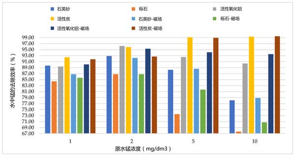 在最后一系列試驗中,作為所進行的工作的一部分,使用錳模型溶液進行試驗。在計算的基礎上,發現在通過活性炭的過濾過程中用磁場處理的樣品中錳的去除效率更高。各濾床上錳和對照水之間的錳去除效率差異(圖3)。另一方面,磁場的使用增加了水的飽和度,其中氧氣是Mn(II)氧化反應為Mn(IV)所必需的。其他吸附材料具有化學惰性,因此通過使用磁場對水的物理和化學性質的影響不會提高鐵和錳離子的效率。