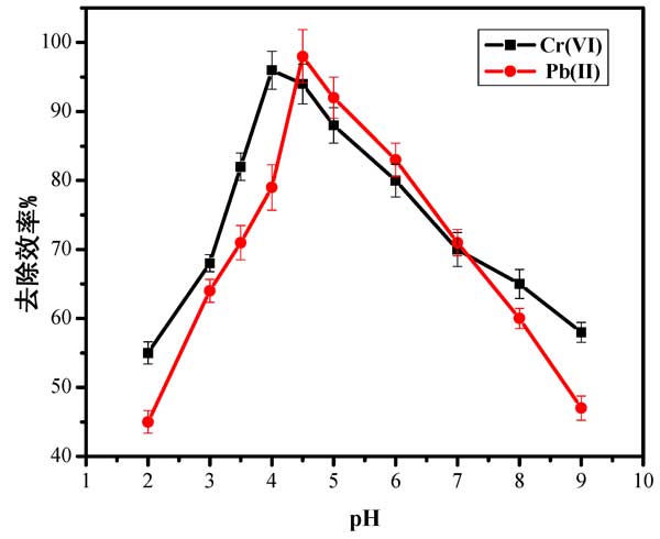pH的影響:系統的吸附效率在很大程度上取決于溶液的pH值。圖2中顯示的數據突出顯示了pH值對Pb(II)和Cr(VI)離子在活性炭上的吸附的影響。在pH 4.6和4下,Pb(II)和Cr(VI)的吸附增加并達到最大值。pH值高于6時,吸附活性降低。這可以歸因于游離離子的減少是由于在較高的pH范圍內形成羥基配合物,金屬離子隨后沉淀。因此,去除效率急劇下降。另一方面,在低于合適pH的pH值下,H+和金屬離子爭奪活性炭表面上相同活性位點上的相同活性位點可能會阻礙吸附活性。