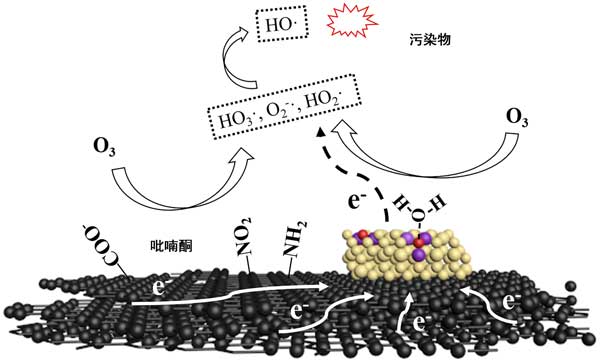圖3:負載鈰的活性炭在催化臭氧氧化系統中生成·OH的可能機理。黑色:石墨烯,棕色:氧化鈰;紅色:氧空位,紫色:Ce 3+。
