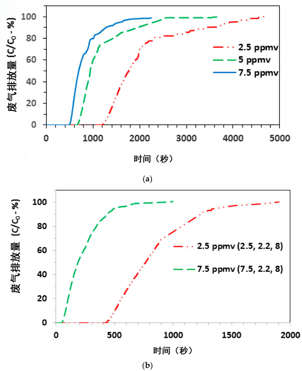 我們進行了一組實驗以評估進水氨濃度對其基于吸附的去除的影響。為此,使用6 cm和8 cm的活性炭色譜柱,在不同的進水氣態氨濃度下進行了幾次實驗。對于8 cm活性炭色譜柱,初始實驗在2.5至7.5 ppmv的氣態氨氣之間進行。分別在1.1和2.2 L/min的氣體流速下的各自發現顯示在圖2a,b中。顯然,隨著進水氨濃度的逐漸降低,突破點也向更長的時間轉移。例如,圖2中的結果a顯示以下突破趨勢:1295分鐘(2.5 ppmv)>712分鐘(5 ppmv)>532分鐘(7.5 ppmv)。此外,各個實驗的排氣時間值還顯示出在較低氣態氨濃度下的較長運行時間,即4000分鐘(2.5 ppmv)>2312分鐘(5 ppmv)>1574分鐘(7.5 ppmv)。此外,圖2中的吸附趨勢通常顯示出較寬的吸附穿透曲線,表明傳質區(MTZ)的長度相對較大。這與苯在活性炭上的吸附有所不同,后者表現出明顯的穿透曲線。對于氨而言,這種不同的趨勢可能歸因于可以與表面酸性基團相互作用的氨部分的基本性質。進入的氣態氨的增加及其從整體氣相到GAC表面的轉移將啟動GAC表面吸附位點(包括孔中的那些位點)更快的消耗。由于各自的表面吸附位點是固定的和有限的,因此預計在較高的進水氨濃度下,較早的突破以及較早的耗盡將逐漸發生。