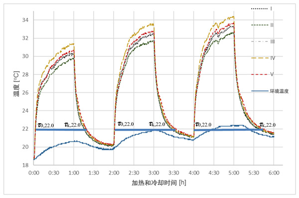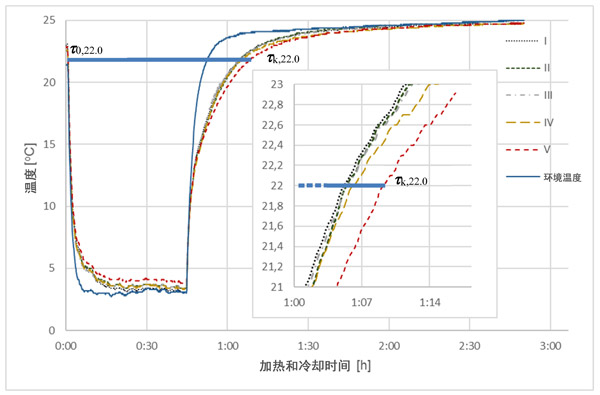 在分析曲線如圖2,圖3和圖4中,并收集結果,在一個溫度(22℃)中選擇,清楚地表明不同相變材料的影響活性炭中的量上的周期時間長度與發生個體樣品中的熱交換過程。相對于溫度傳感器的更高的質量和熱容量,即使吸附的相變材料的量很小,也可以看到處理時間的差異。當與參比樣品(I),沒有相變材料,總的冷卻和加熱時間的所有樣品與相變材料的不同水平長。對于樣品V,此時間延長了7.5%,對于樣品IV,延長了5.2%,對于III,延長了2.4%,對于樣品II(未活化的活性炭),僅延長了0.2%。
