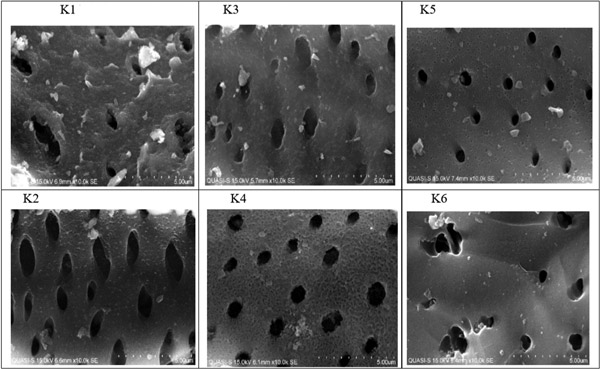 對原始活性炭(圖3中的K1)的掃描顯示出相當均勻的孔。活性炭的結構可以看作是薄片,為不規則分布和各種尺寸的孔提供了較大的吸附面積。表面上的大多數可見孔都在5微米范圍內,這與對椰殼活性炭的預期一致,而在這5微米孔內可以看到小于1微米的較小孔。圖3中的K2顯示了在氯酸鹽吸附到表面活性部位后活性炭表面的變化。這些孔有變化的跡象,因為其中一些吸附氯酸鹽,而其他孔被氯酸鹽和氯化物分子阻塞。在10,000倍的放大倍率下,可以觀察到小孔周圍和大孔入口處的沉積,因為預計表面活性基團會大量存在于這些區域。活性炭的酸性再生極有可能形成了表面活性部位,從而增強了活性炭吸附大量氯酸鹽的能力。