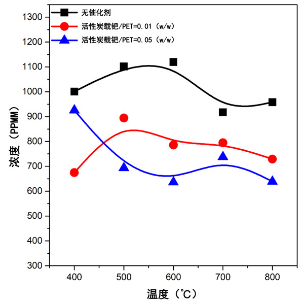 活性炭載鈀催化劑的高表面積歸因于活性炭載體。盡管金屬負載量為5 wt%,高表面積仍可實現高鈀分散度(42%)。已知活性炭具有很高的熱穩定性,因此在熱解過程中大部分保留了活性炭的孔隙率。圖1顯示了在有和沒有鈀催化劑的情況下,由PET熱解獲得的多環烴和聯苯衍生物的濃度比較。使用不同的活性炭載鈀催化劑/PET比確定熱解過程中催化劑的作用。隨著熱解溫度的升高,三種類型的多環烴(2-萘甲酸,芴酮和三亞苯基)的濃度增加,這是因為環化反應在較高溫度下更有利地形成了苯環。