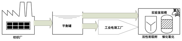 來自紡織廠的紡織廢水被存儲在均衡罐中,并轉移到工業規模的電凝處理廠。此后,如圖1所示,在實驗室中進行了催化臭氧氧化,然后進行了吸附階段。單次吸附:在催化臭氧氧化之前,對于所有催化劑,吸附實驗均進行了30分鐘。將活性炭催化劑直接添加到廢水中。吸附在與臭氧化處理相同的反應器中進行,但沒有臭氧入口以維持均勻的實驗條件。所有實驗條件與臭氧化處理期間相同。溫度保持穩定并且等于23±1℃。活性炭催化臭氧化:使用與吸附和臭氧化相同的反應器進行催化臭氧化。所有實驗條件與臭氧化處理期間相同。對于所有催化劑,每次催化劑濃度為0.5g/L。反應后,進行催化劑的過濾(0.45μm過濾器)。