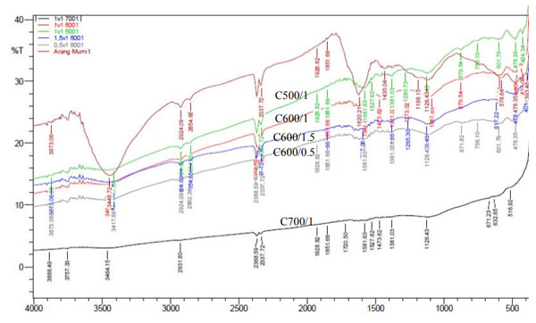 對于峰的強度,活化溫度在降低強度中起重要作用。較高的溫度將產生具有較少官能團的活性炭。最高活化溫度樣品顯示幾乎平坦的光譜。同時,對于活化劑定量,效果很小。比率從0.5增加到1.5似乎對樣品的化學性質沒有任何影響,因為三個光譜相似。