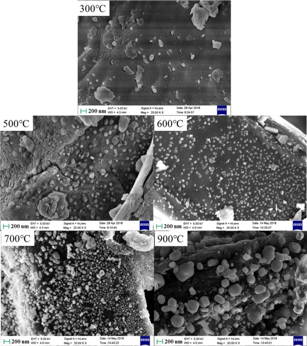 圖1:在不同溫度下生產的活性炭掃描電子顯微鏡圖像。