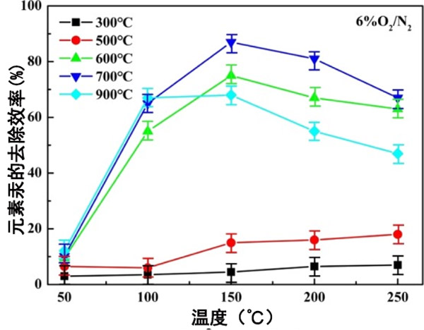 在不同的反應溫度條件下,研究了在不同熱解溫度下形成的活性炭對元素汞的去除效率。如圖所示​圖2,300炭和500炭在50–250°C時表現出較差的元素汞去除活性,在此溫度范圍內去除效率未達到20%以上。在較低的熱解溫度下生產的樣品中含氧官能團較多,并且其元素汞去除效率較差,含氧官能團在元素汞的催化氧化中并不占優勢。這些結果可能是由于在較低溫度下熱解時在活性炭的表面孔隙不足。使用600炭,700炭和900炭時,元素汞的去除效率隨較高的反應溫度而增加,而當反應溫度進一步升高至>200°C時,元素汞的去除效率則降低。這很可能是由于抑制元素汞的物理吸附和吸附的元素汞脫附的綜合作用。當反應溫度約為150°C時,活性炭表現出相對較高的元素汞去除效率。