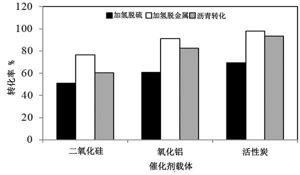 使用原油中的真空殘留物作為原料,在間歇反應器中評估了加氫處理活性。因為所有反應都是在幾乎相同的條件下進行的,所以轉化率的差異主要歸因于所用催化劑的性質。原料的性質包含高瀝青質(22%),硫(5.45%)和其它金屬含量。在圖2中,已經提出了不同催化劑的加氫處理活性,使用活性炭,二氧化硅和氧化鋁為載體的催化劑獲得的加氫脫硫轉化率分別為70%,58%和61%。負載在氧化鋁上的催化劑具有高的加氫脫硫轉化率。