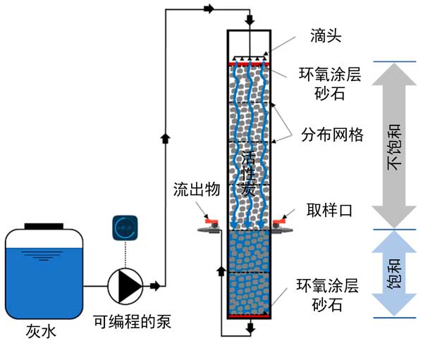圖1:用于灰水處理的實驗室規模的單級不飽和飽和活性炭濾池的示意圖。