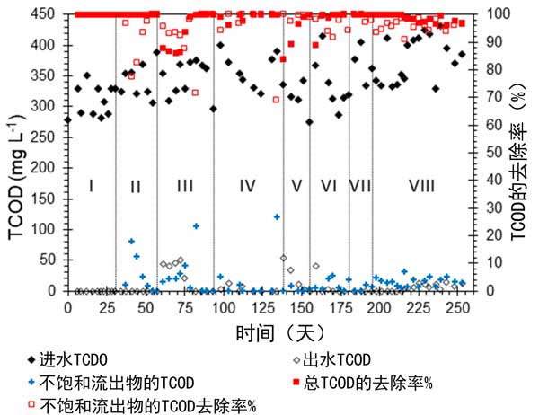 活性炭濾池在順利運行253天后。在八個即操作條件下運行,其中水力負荷率和有機負荷率逐漸增加,水力停留時間降低。圖2顯示了在整個操作的八個階段中,進水,不飽和區流出物和最終流出物中的總化學需氧量濃度,以及其在不飽和區和飽和區中的去除效率。在這些階段中,活性炭始終實現了98%的平均總化學需氧量去除率,介于84%和>99%之間。沐浴和洗衣用合成灰水中的大多數有機物都是表面活性劑,它們來自洗滌劑和肥皂。表面活性劑的吸附及其需氧生物降解以前也有過測試。在特定條件下,活性炭可有效去除表面活性劑,效率達98%。使用需氧處理的表面活性劑的生物降解效率已經報道了超過在大多數情況下90%,并且可以實現99.9%的去除效率。廢水的總化學需氧量平均為5.3mg,當水力負荷率和有機負荷率逐從一個階段增加到另一個階段時,會出現一些峰。第六階段之后,在廢水中未觀察到銳利的化學需氧量峰。這可以歸因于在活性炭培養基上生長的生物膜的成熟。由于從階段VI開始開始出現不飽和區流出物的峰值,因此在飽和區的成熟明顯更為明顯。