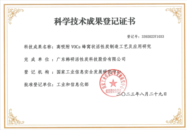 本次科學技術成果鑒定由國家工業信息安全發展研究中心依據《中華人民共和國科學技術進步法》、《中華人民共和國促進科技成果轉化法》、《科學技術評價辦法》、《科技評估管理暫行辦法》,在北京主持召開由韓研股份研發的“高吸附 VOCs 蜂窩狀活性炭制造工藝及應用研究”科技成果評價會。期間嚴格按照《科技成果評價試點暫行辦法》的有關規定和要求,秉承客觀、公正、獨立的原則,聘請專家對該項科技成果進行評價。評價委員會聽取了項目完成單位的技術總結報告,對評價資料進行了審查,經嚴格質詢和充分討論形成一致意見:本技術成果達國際先進水平。